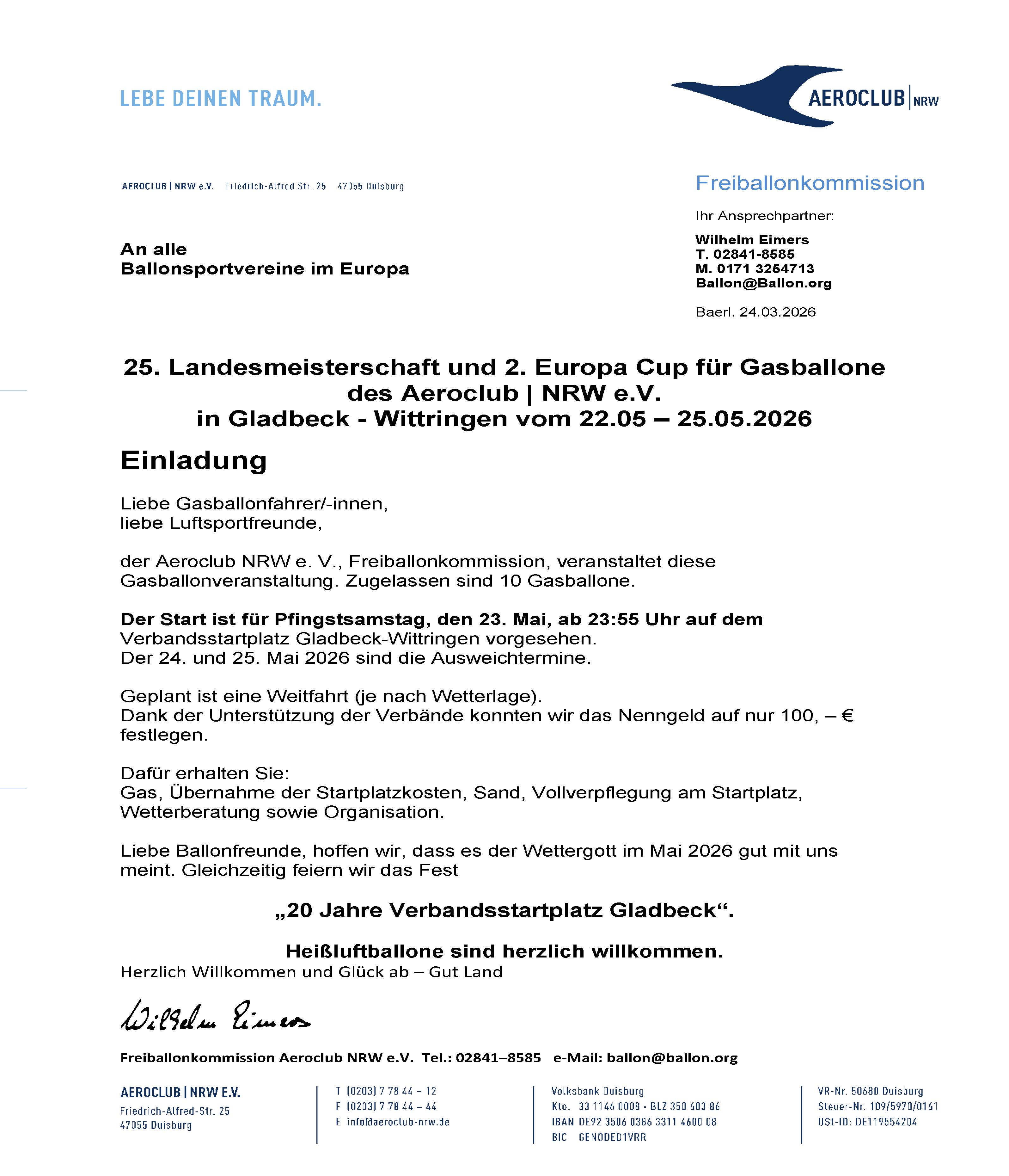 21. offene Gasballon - Landesmeisterschaft des Aeroclub | NRW e.V. in Gladbeck - Wittringen vom 03.06. – 05.06.2017 Einladung Liebe Gasballonfahrer / innen, der DAeC LV NRW, Freiballonkommission veranstaltet diese Gasballonveranstaltung. Zugelassen sind 20 Gasballone. Der Start ist für Pfingstsamstag den 03. Juni 2017 auf dem Verbandsstartplatz Gladbeck - Wittringen vorgesehen. Geplant ist eine begrenzte Dauerfahrt (je nach Wetterlage). Dank der Unterstützung des Verbandes haben wir das Nenngeld auf nur Euro 100,- (einhundert) festgelegt. Dafür erhalten Sie: Gas, Übernahme der Startplatzkosten, Sand, Allzeit Verpflegung am Startplatz, Wetterberatung, Organisation. Liebe Ballonfreunde, hoffen wir, dass es der Wettergott im April 2017 gut mit uns meint. Wir werden 24 h vor Wettfahrtbeginn entscheiden, ob das Wetter einen Start zulässt. Damit möchten wir eine unnötige Anreise vermeiden. Glück ab und Gut Land Wilhelm Eimers ------------------------------------------------------ Vorsitzender der Freiballonkommission des Aeroclub | NRW e.V. Freiballonkommission Dokumente: EINLADUNG (PDF) ZEITPLAN (PDF) ANMELDUNG (PDF) ANMELDUNG (DOC) |